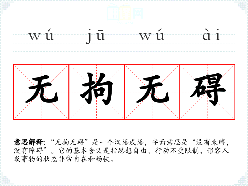 “无拘无碍”是一个汉语成语,字面意思是“没有束缚,没有障碍”。它的基本含义是指思想自由、行动不受限制,形容人或事物的状态非常自在和畅快。