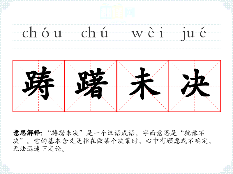 “踌躇未决”是一个汉语成语,字面意思是“犹豫不决”。它的基本含义是指在做某个决策时,心中有顾虑或不确定,无法迅速下定论。