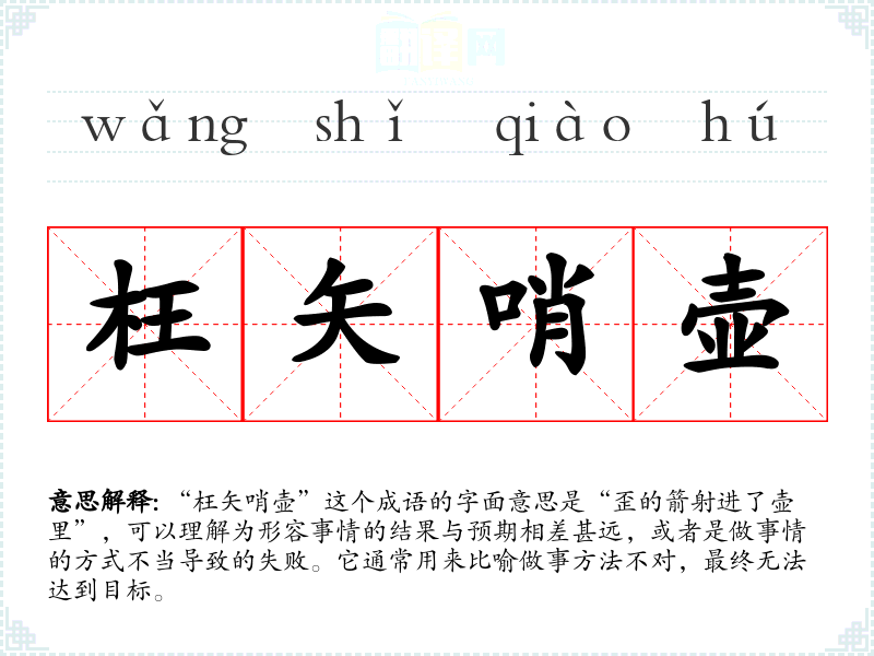 “枉矢哨壶”这个成语的字面意思是“歪的箭射进了壶里”,可以理解为形容事情的结果与预期相差甚远,或者是做事情的方式不当导致的失败。它通常用来比喻做事方法不对,最终无法达到目标。