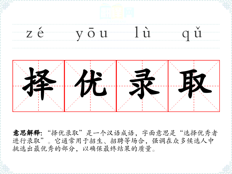 “择优录取”是一个汉语成语,字面意思是“选择优秀者进行录取”。它通常用于招生、招聘等场合,强调在众多候选人中挑选出最优秀的部分,以确保最终结果的质量。