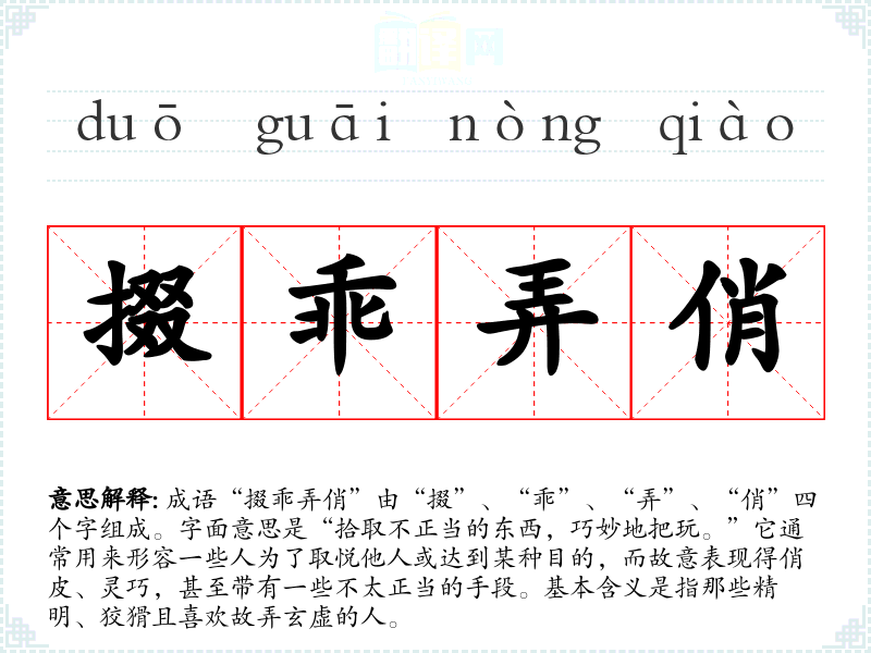 - 反义成语:诚实守信。这些成语强调真诚与信用,与“掇乖弄俏”的含义形成鲜明对比。