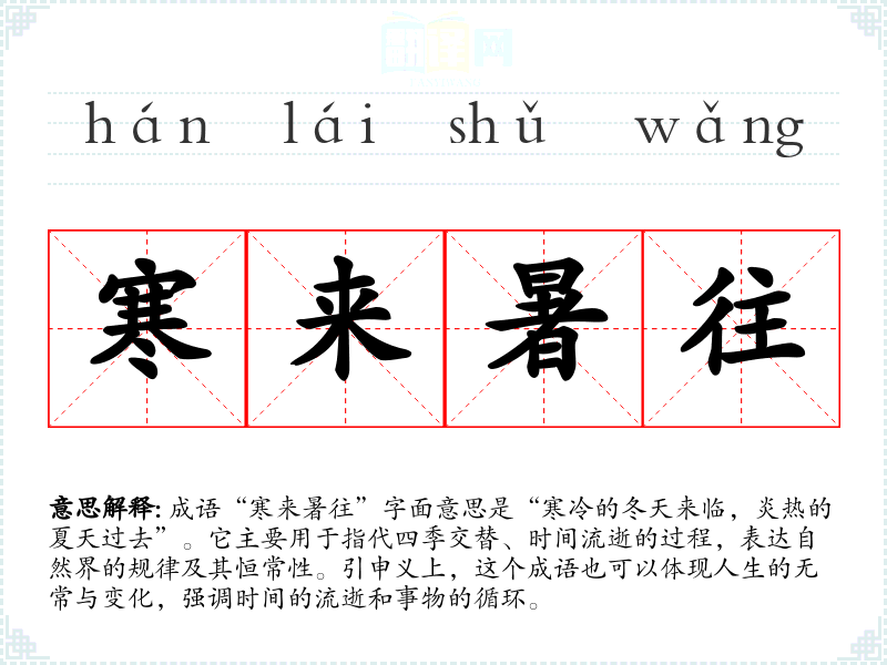 在英语中,类似的表达是“time flies”或“seasons change”,传达了时间流逝和变化的概念。但中文的“寒来暑往”更具体地描绘了季节的变化,结合了自然与人文的深厚内涵。