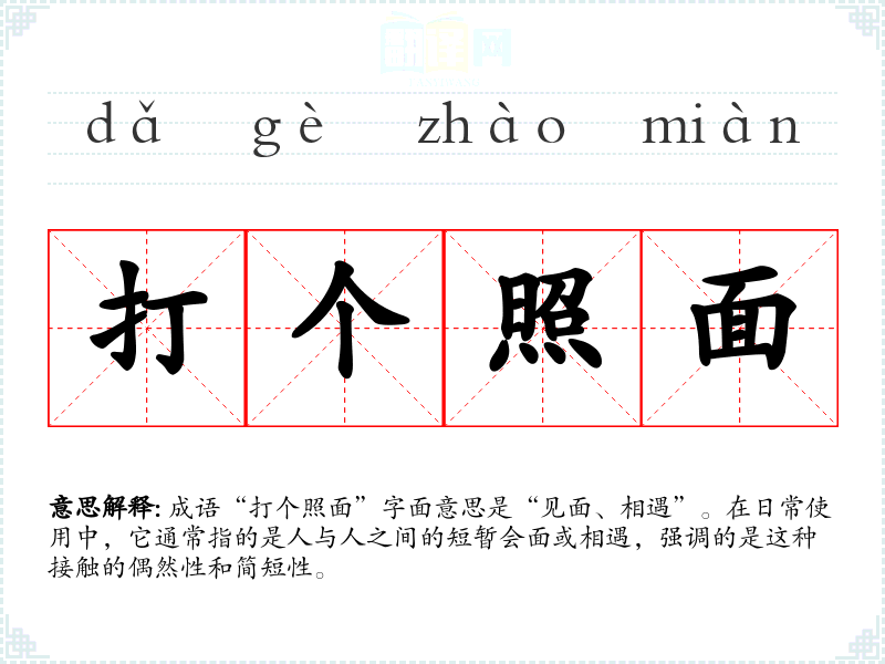 成语“打个照面”字面意思是“见面、相遇”。在日常使用中,它通常指的是人与人之间的短暂会面或相遇,强调的是这种接触的偶然性和简短性。