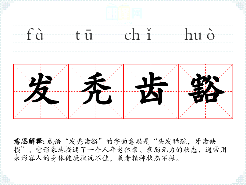 “发秃齿豁”并不是一个广为人知的成语,可能是对某些常见词汇的组合,类似于“白发苍苍”、“满口牙齿”等表达。然而,它的构成可以追溯到描述人衰老和身体变化的古典文学作品中。例如,在古代诗词中,常用“白发”、“苍颜”等词汇来描绘老年人的形象,从而表达对年华流逝的感慨。
