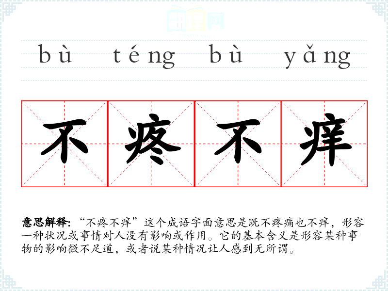“不疼不痒”这个成语字面意思是既不疼痛也不痒,形容一种状况或事情对人没有影响或作用。它的基本含义是形容某种事物的影响微不足道,或者说某种情况让人感到无所谓。