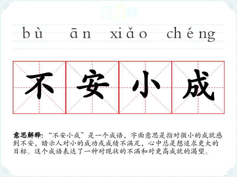 “不安小成”是一个成语,字面意思是指对微小的成就感到不安,暗示人对小的成功或成绩不满足,心中总是想追求更大的目标。这个成语表达了一种对现状的不满和对更高成就的渴望。