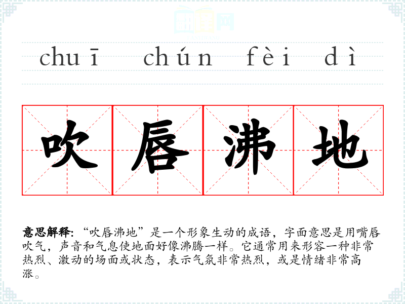 “吹唇沸地”是一个形象生动的成语,字面意思是用嘴唇吹气,声音和气息使地面好像沸腾一样。它通常用来形容一种非常热烈、激动的场面或状态,表示气氛非常热烈,或是情绪非常高涨。