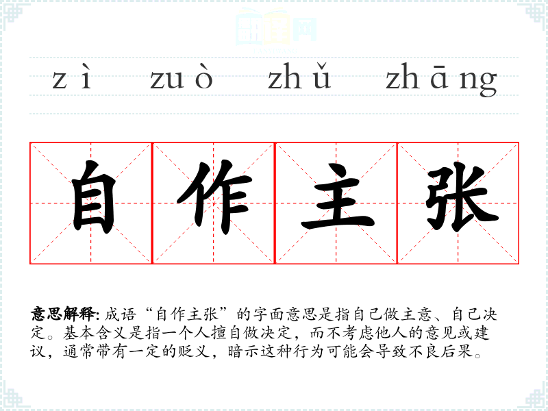 成语“自作主张”的字面意思是指自己做主意、自己决定。基本含义是指一个人擅自做决定,而不考虑他人的意见或建议,通常带有一定的贬义,暗示这种行为可能会导致不良后果。