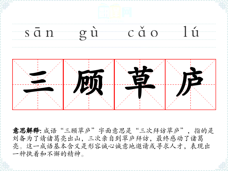 成语“三顾草庐”字面意思是“三次拜访草庐”,指的是刘备为了请诸葛亮出山,三次亲自到草庐拜访,最终感动了诸葛亮。这一成语基本含义是形容诚心诚意地邀请或寻求人才,表现出一种执着和不懈的精神。