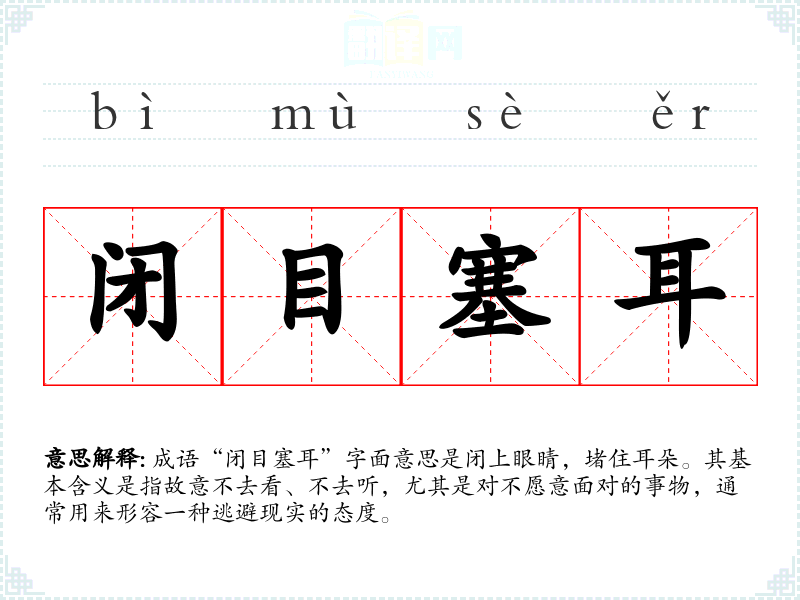成语“闭目塞耳”字面意思是闭上眼睛,堵住耳朵。其基本含义是指故意不去看、不去听,尤其是对不愿意面对的事物,通常用来形容一种逃避现实的态度。