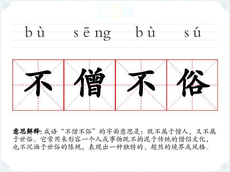 成语“不僧不俗”的字面意思是:既不属于僧人,又不属于世俗。它常用来形容一个人或事物既不拘泥于传统的僧侣文化,也不沉湎于世俗的陈规,表现出一种独特的、超然的境界或风格。