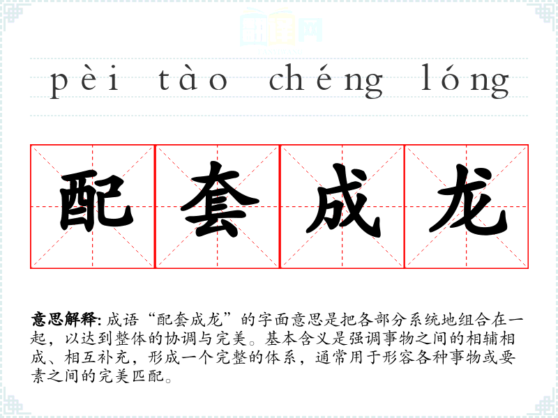 成语“配套成龙”的字面意思是把各部分系统地组合在一起,以达到整体的协调与完美。基本含义是强调事物之间的相辅相成、相互补充,形成一个完整的体系,通常用于形容各种事物或要素之间的完美匹配。