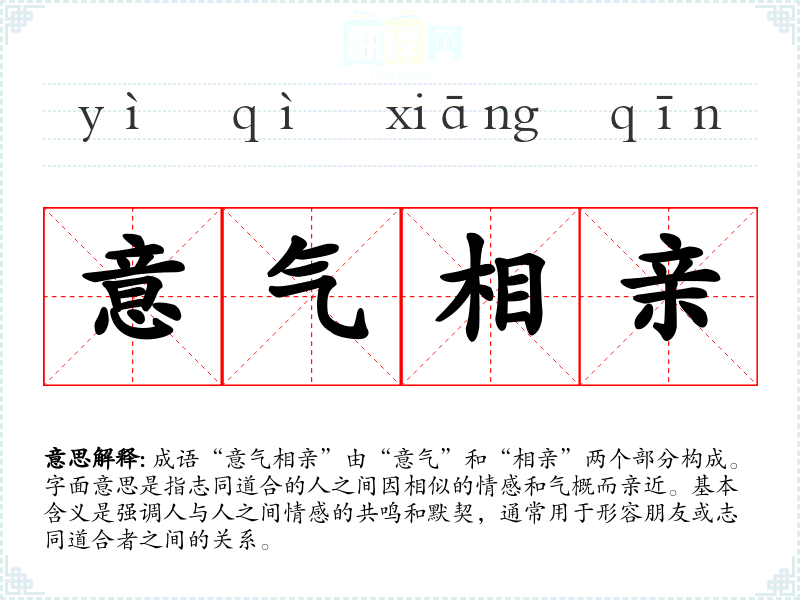 成语“意气相亲”由“意气”和“相亲”两个部分构成。字面意思是指志同道合的人之间因相似的情感和气概而亲近。基本含义是强调人与人之间情感的共鸣和默契,通常用于形容朋友或志同道合者之间的关系。