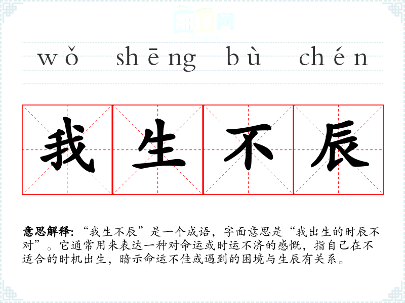 “我生不辰”是一个成语,字面意思是“我出生的时辰不对”。它通常用来表达一种对命运或时运不济的感慨,指自己在不适合的时机出生,暗示命运不佳或遇到的困境与生辰有关系。