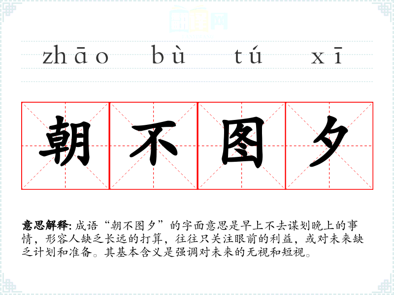 成语“朝不图夕”的字面意思是早上不去谋划晚上的事情,形容人缺乏长远的打算,往往只关注眼前的利益,或对未来缺乏计划和准备。其基本含义是强调对未来的无视和短视。