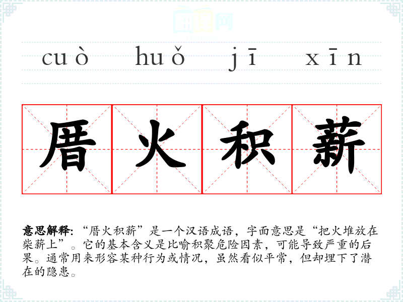 “厝火积薪”是一个汉语成语,字面意思是“把火堆放在柴薪上”。它的基本含义是比喻积聚危险因素,可能导致严重的后果。通常用来形容某种行为或情况,虽然看似平常,但却埋下了潜在的隐患。
