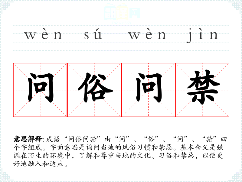 成语“问俗问禁”由“问”、“俗”、“问”、“禁”四个字组成。字面意思是询问当地的风俗惯和禁忌。基本含义是强调在陌生的环境中,了解和尊重当地的文化、俗和禁忌,以便更好地融入和适应。