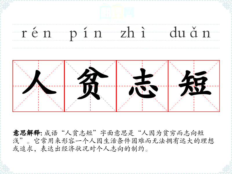 成语“人贫志短”字面意思是“人因为贫穷而志向短浅”。它常用来形容一个人因生活条件困难而无法拥有远大的理想或追求,表达出经济状况对个人志向的制约。