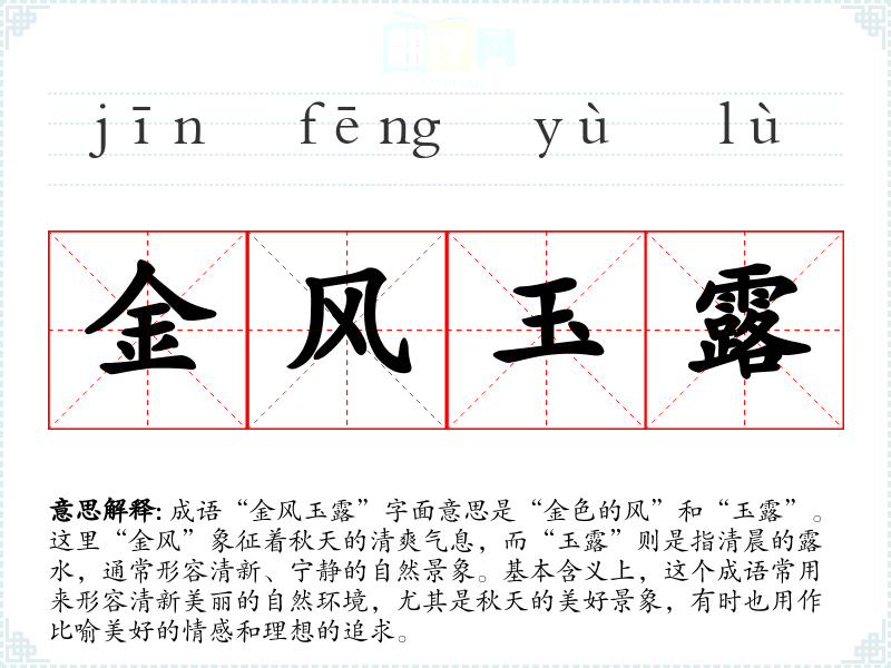 成语“金风玉露”字面意思是“金色的风”和“玉露”。这里“金风”象征着秋天的清爽气息,而“玉露”则是指清晨的露水,通常形容清新、宁静的自然景象。基本含义上,这个成语常用来形容清新美丽的自然环境,尤其是秋天的美好景象,有时也用作比喻美好的情感和理想的追求。