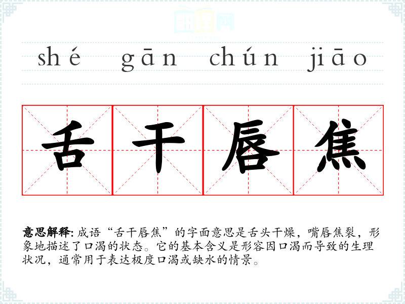 成语“舌干唇焦”的字面意思是舌头干燥,嘴唇焦裂,形象地描述了口渴的状态。它的基本含义是形容因口渴而导致的生理状况,通常用于表达极度口渴或缺水的情景。