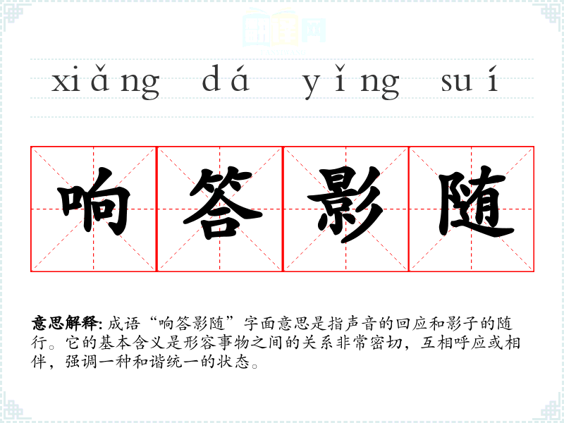 成语“响答影随”字面意思是指声音的回应和影子的随行。它的基本含义是形容事物之间的关系非常密切,互相呼应或相伴,强调一种和谐统一的状态。