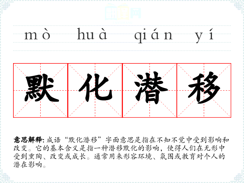“默化潜移”源于古代汉语,最早可以追溯到《周易》中的“柔蓄而志,故君子以懿德”。在《论语》中也可以找到类似的思想,强调潜移默化的教育和影响。成语的形成可能与儒家思想有关,强调道德修养和环境对人的影响。