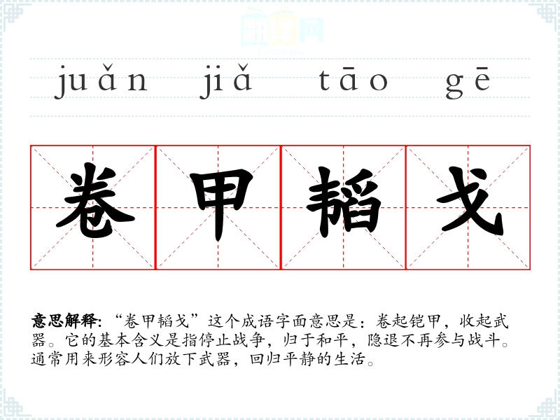 “卷甲韬戈”这个成语字面意思是:卷起铠甲,收起武器。它的基本含义是指停止战争,归于和平,隐退不再参与战斗。通常用来形容人们放下武器,回归平静的生活。