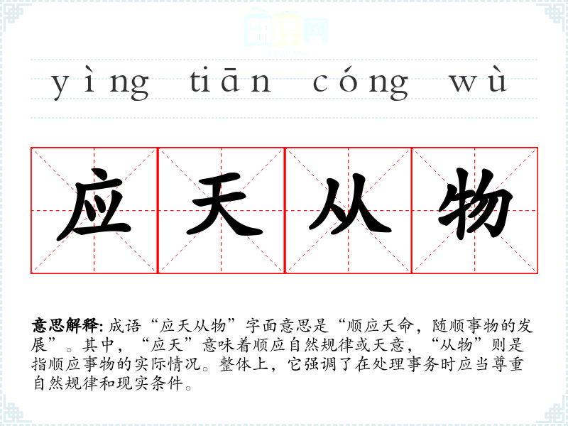 成语“应天从物”字面意思是“顺应天命,随顺事物的发展”。其中,“应天”意味着顺应自然规律或天意,“从物”则是指顺应事物的实际情况。整体上,它强调了在处理事务时应当尊重自然规律和现实条件。