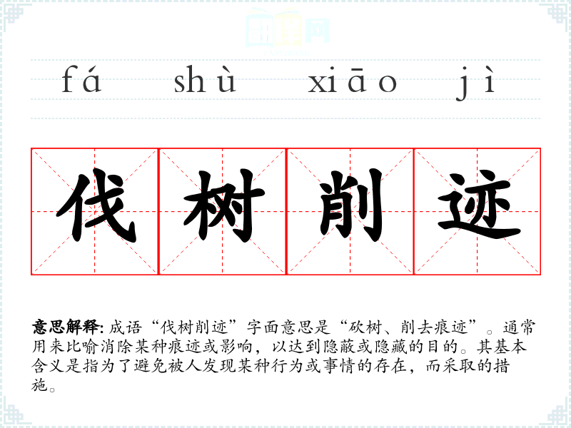 成语“伐树削迹”字面意思是“砍树、削去痕迹”。通常用来比喻消除某种痕迹或影响,以达到隐蔽或隐藏的目的。其基本含义是指为了避免被人发现某种行为或事情的存在,而采取的措施。