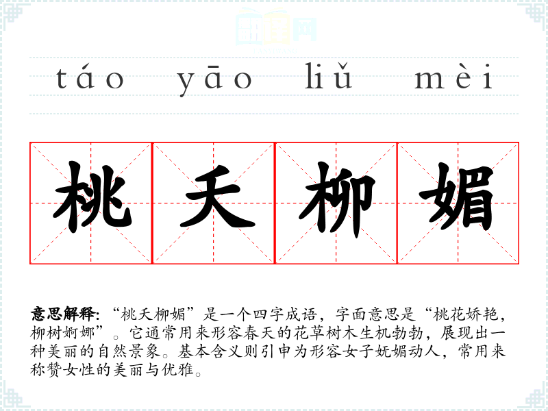 “桃夭柳媚”是一个四字成语,字面意思是“桃花娇艳,柳树婀娜”。它通常用来形容春天的花草树木生机勃勃,展现出一种美丽的自然景象。基本含义则引申为形容女子妩媚动人,常用来称赞女性的美丽与优雅。