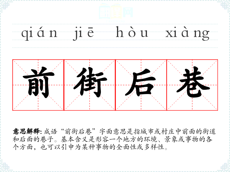 成语“前街后巷”字面意思是指城市或村庄中前面的街道和后面的巷子。基本含义是形容一个地方的环境、景象或事物的各个方面,也可以引申为某种事物的全面性或多样性。