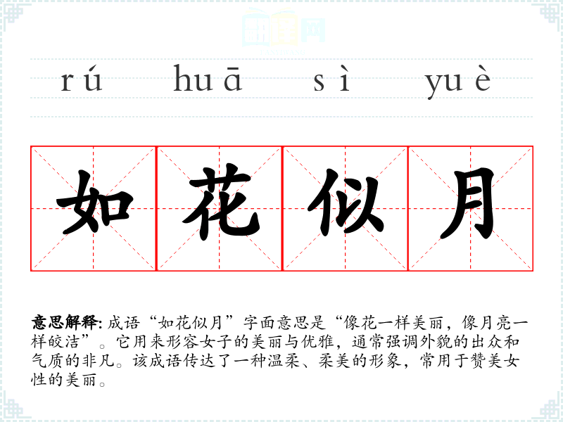 “如花似月”出自唐代诗人白居易的《红楼梦》。在这一作品中,白居易通过细腻的描绘表达了对女性美丽的赞美。成语的形成是对传统美学的体现,反映了古代文人对于女性美的理想化追求。