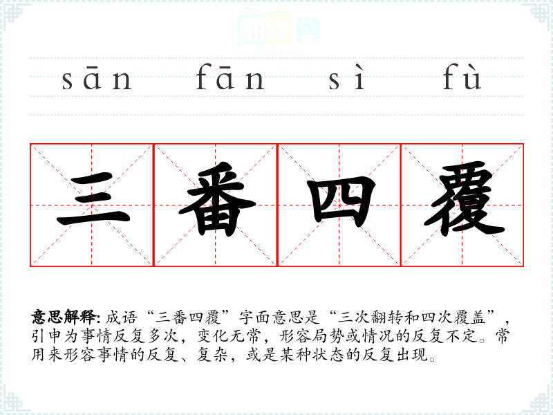 成语“三番四覆”字面意思是“三次翻转和四次覆盖”,引申为事情反复多次,变化无常,形容局势或情况的反复不定。常用来形容事情的反复、复杂,或是某种状态的反复出现。