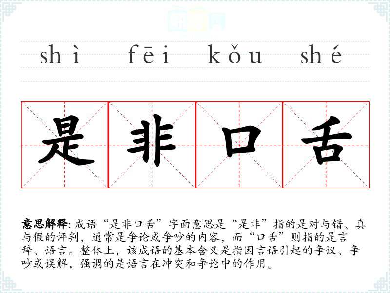 成语“是非口舌”字面意思是“是非”指的是对与错、真与假的评判,通常是争论或争吵的内容,而“口舌”则指的是言辞、语言。整体上,该成语的基本含义是指因言语引起的争议、争吵或误解,强调的是语言在冲突和争论中的作用。