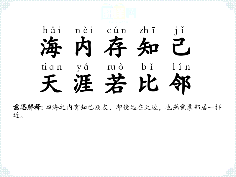四海之内有知己朋友,即使远在天边,也感觉象邻居一样近。 |