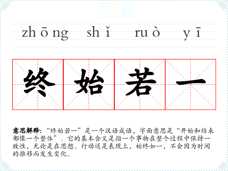“终始若一”是一个汉语成语,字面意思是“开始和结束都像一个整体”。它的基本含义是指一个事物在整个过程中保持一致性,无论是在思想、行动还是表现上,始终如一,不会因为时间的推移而发生变化。