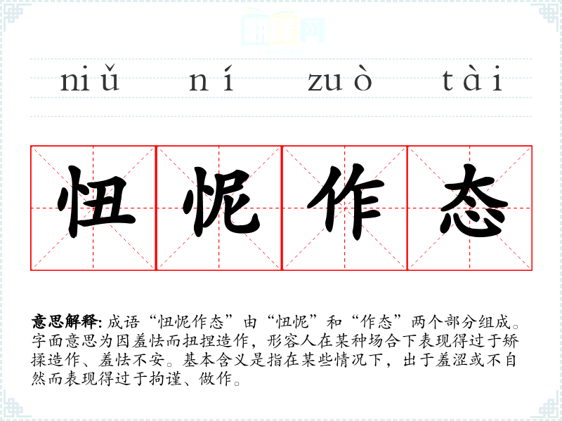 成语“忸怩作态”由“忸怩”和“作态”两个部分组成。字面意思为因羞怯而扭捏造作,形容人在某种场合下表现得过于矫揉造作、羞怯不安。基本含义是指在某些情况下,出于羞涩或不自然而表现得过于拘谨、做作。