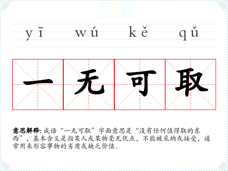 成语“一无可取”字面意思是“没有任何值得取的东西”,基本含义是指某人或某物毫无优点,不能被采纳或接受,通常用来形容事物的劣质或缺乏价值。