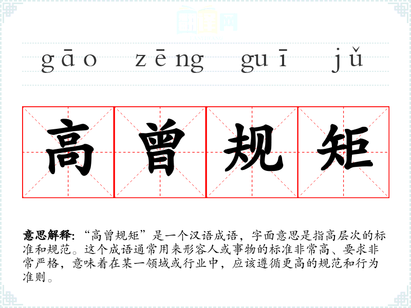 “高曾规矩”是一个汉语成语,字面意思是指高层次的标准和规范。这个成语通常用来形容人或事物的标准非常高、要求非常严格,意味着在某一领域或行业中,应该遵循更高的规范和行为准则。