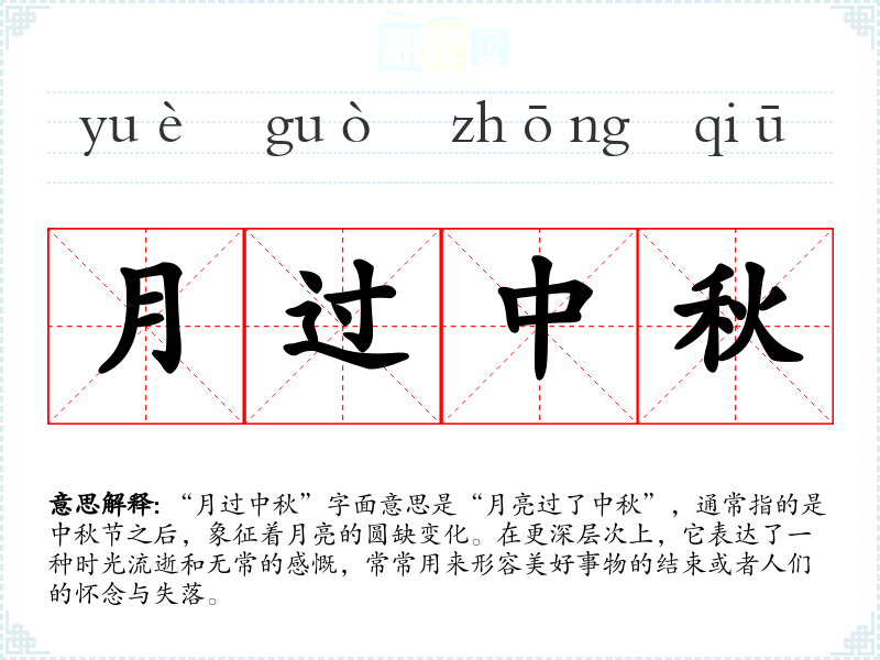 “月过中秋”字面意思是“月亮过了中秋”,通常指的是中秋节之后,象征着月亮的圆缺变化。在更深层次上,它表达了一种时光流逝和无常的感慨,常常用来形容美好事物的结束或者人们的怀念与失落。
