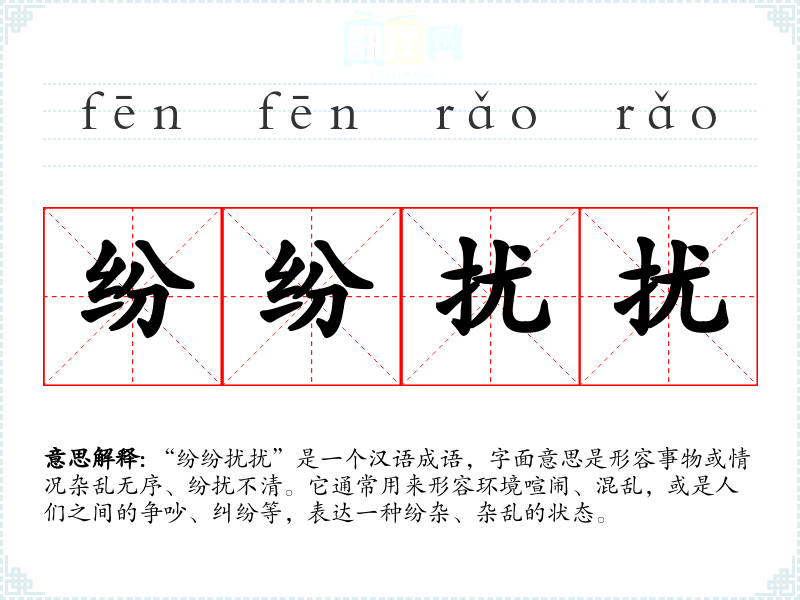 “纷纷扰扰”是一个汉语成语,字面意思是形容事物或情况杂乱无序、纷扰不清。它通常用来形容环境喧闹、混乱,或是人们之间的争吵、纠纷等,表达一种纷杂、杂乱的状态。