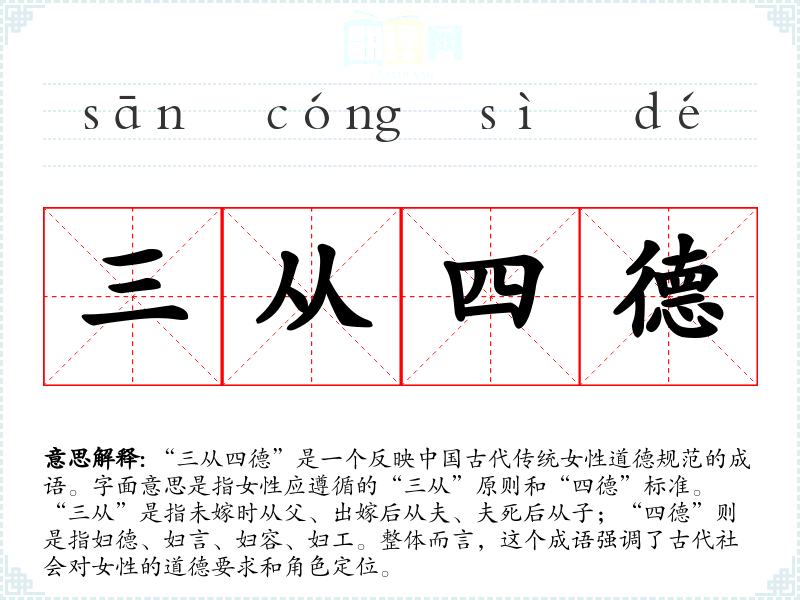 “三从四德”是一个反映**古代传统女性道德规范的成语。字面意思是指女性应遵循的“三从”原则和“四德”标准。“三从”是指未嫁时从父、出嫁后从夫、夫死后从子;“四德”则是指妇德、妇言、妇容、妇工。整体而言,这个成语强调了古代社会对女性的道德要求和角色定位。