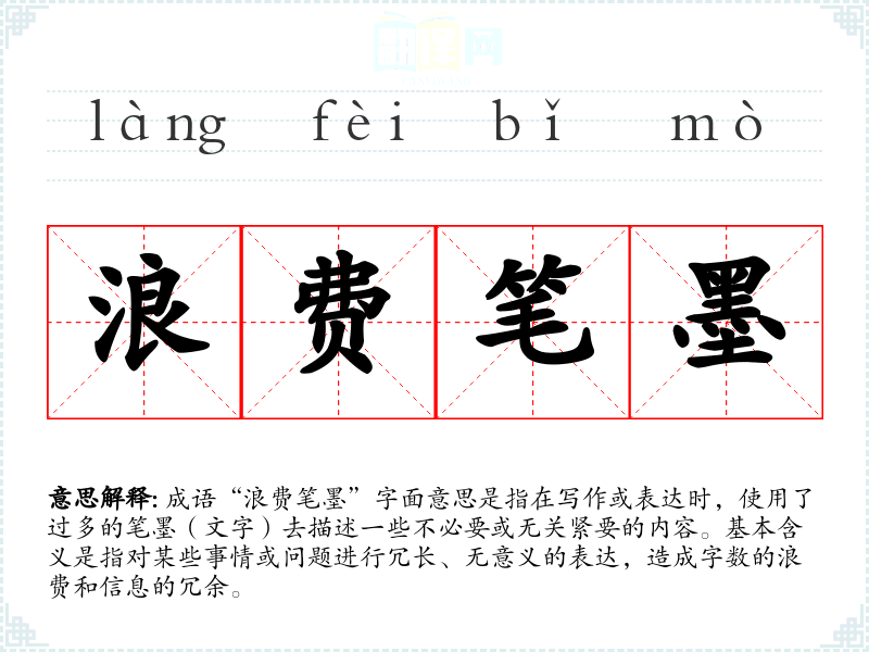 成语“浪费笔墨”字面意思是指在写作或表达时,使用了过多的笔墨(文字)去描述一些不必要或无关紧要的内容。基本含义是指对某些事情或问题进行冗长、无意义的表达,造成字数的浪费和信息的冗余。
