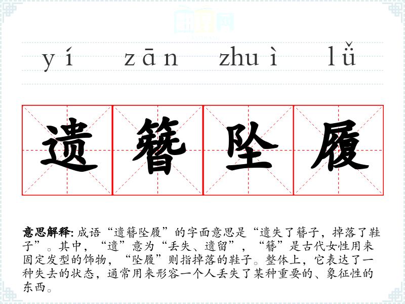 成语“遗簪坠履”的字面意思是“遗失了簪子,掉落了鞋子”。其中,“遗”意为“丢失、遗留”,“簪”是古代女性用来固定发型的饰物,“坠履”则指掉落的鞋子。整体上,它表达了一种失去的状态,通常用来形容一个人丢失了某种重要的、象征性的东西。