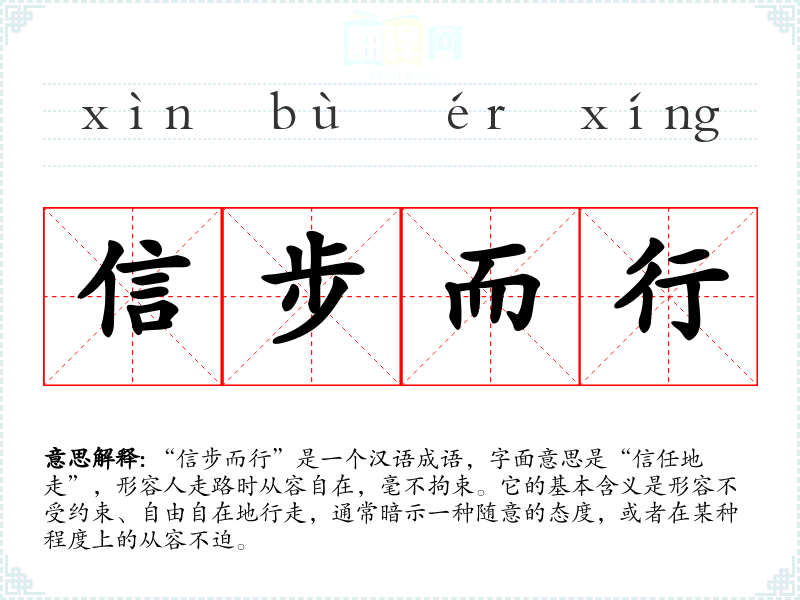 “信步而行”是一个汉语成语,字面意思是“信任地走”,形容人走路时从容自在,毫不拘束。它的基本含义是形容不受约束、自由自在地行走,通常暗示一种随意的态度,或者在某种程度上的从容不迫。