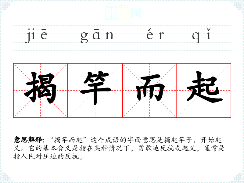 “揭竿而起”这个成语的字面意思是揭起竿子,开始起义。它的基本含义是指在某种情况下,勇敢地反抗或起义,通常是指人民对压迫的反抗。