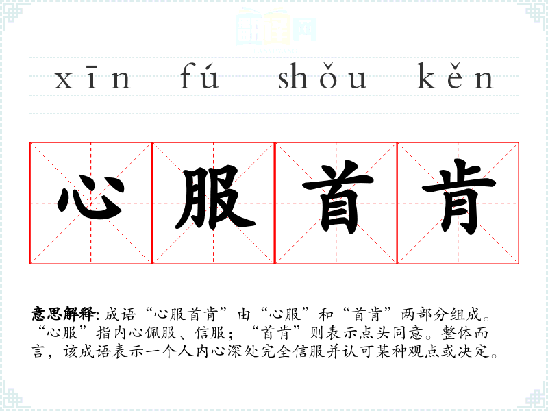 成语“心服首肯”由“心服”和“首肯”两部分组成。“心服”指内心佩服、信服;“首肯”则表示点头同意。整体而言,该成语表示一个人内心深处完全信服并认可某种观点或决定。