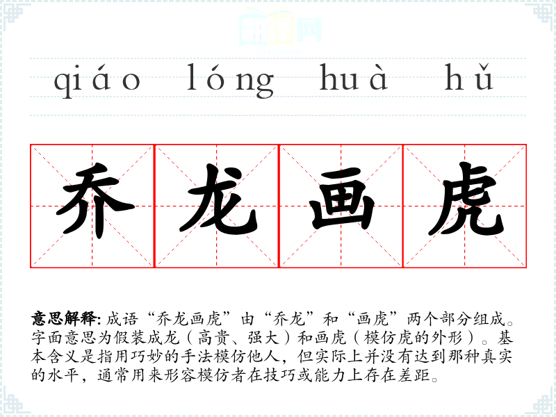 成语“乔龙画虎”由“乔龙”和“画虎”两个部分组成。字面意思为假装成龙(高贵、强大)和画虎(模仿虎的外形)。基本含义是指用巧妙的手法模仿他人,但实际上并没有达到那种真实的水平,通常用来形容模仿者在技巧或能力上存在差距。