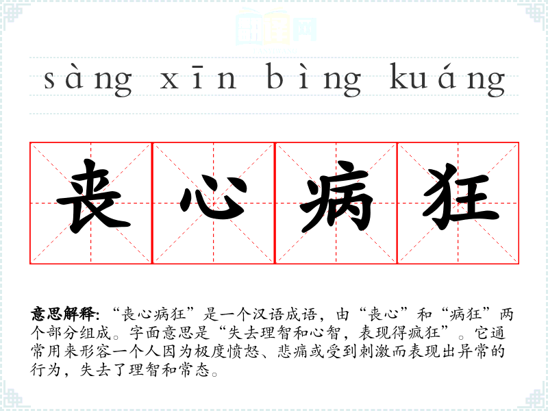 “丧心病狂”是一个汉语成语,由“丧心”和“病狂”两个部分组成。字面意思是“失去理智和心智,表现得疯狂”。它通常用来形容一个人因为极度愤怒、悲痛或受到刺激而表现出异常的行为,失去了理智和常态。