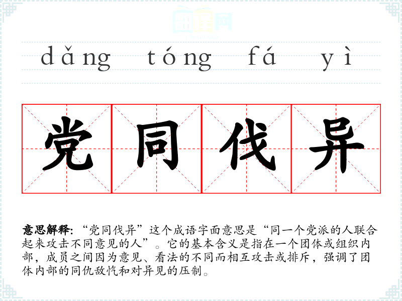“党同伐异”这个成语字面意思是“同一个党派的人联合起来攻击不同意见的人”。它的基本含义是指在一个团体或组织内部,成员之间因为意见、看法的不同而相互攻击或排斥,强调了团体内部的同仇敌忾和对异见的压制。
